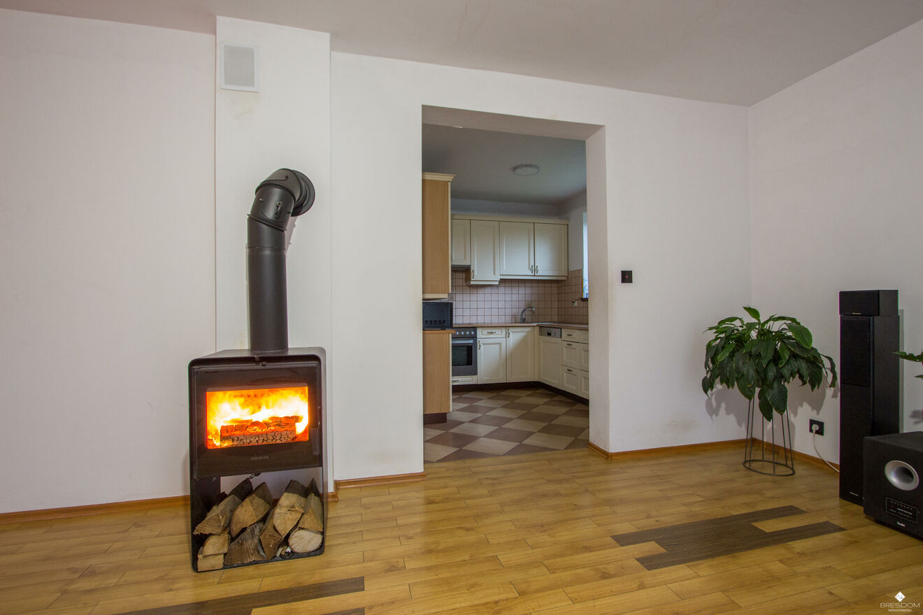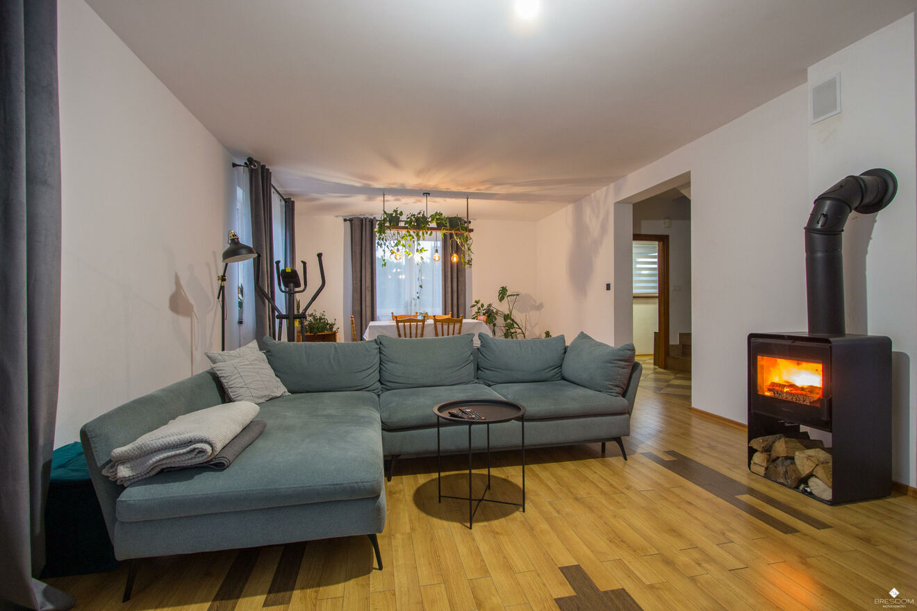 Budynek ogrzewany jest dwufunkcyjnym piecem gazowym, w salonie zamontowany jest wolnostojący kominek.
